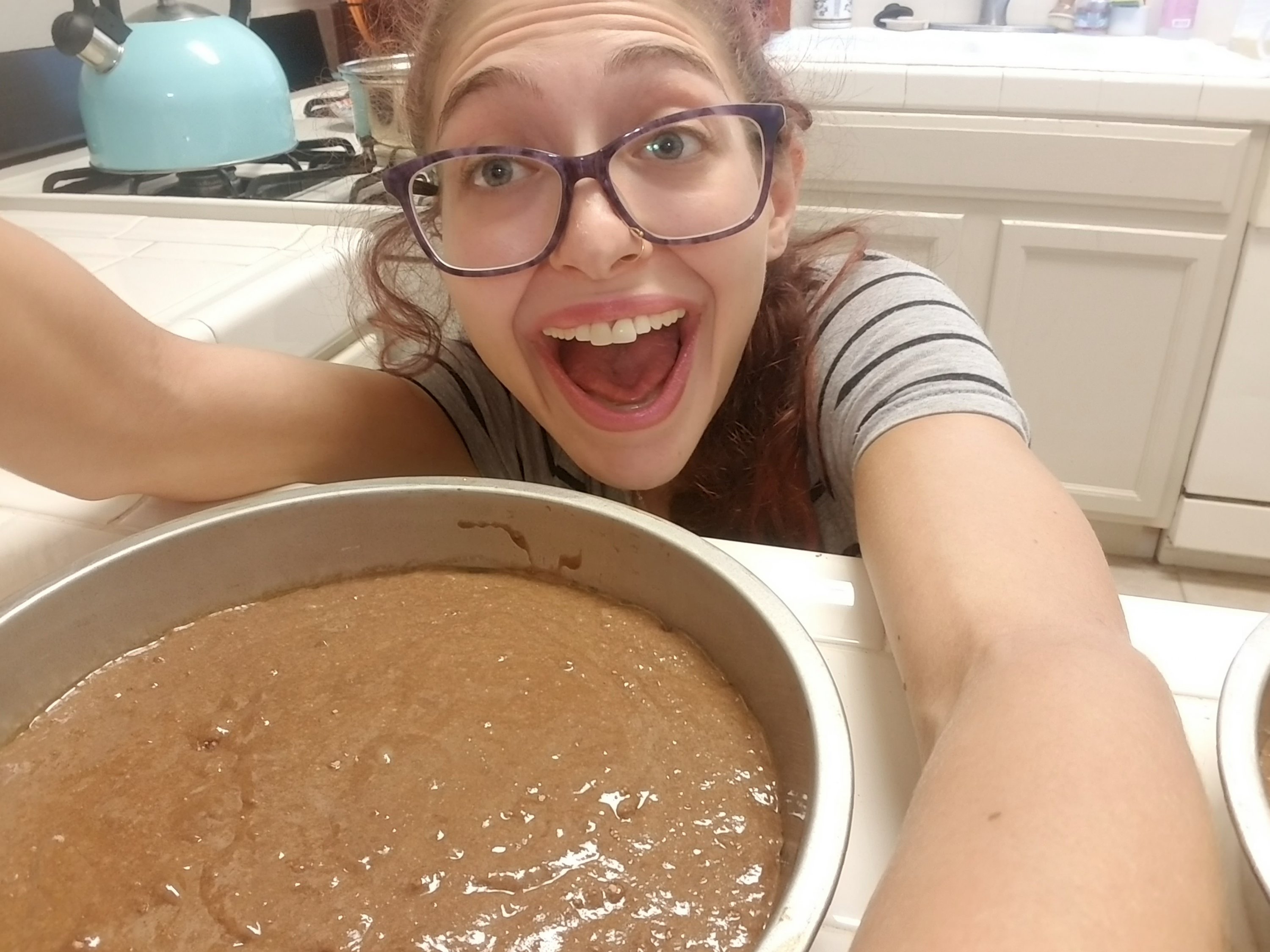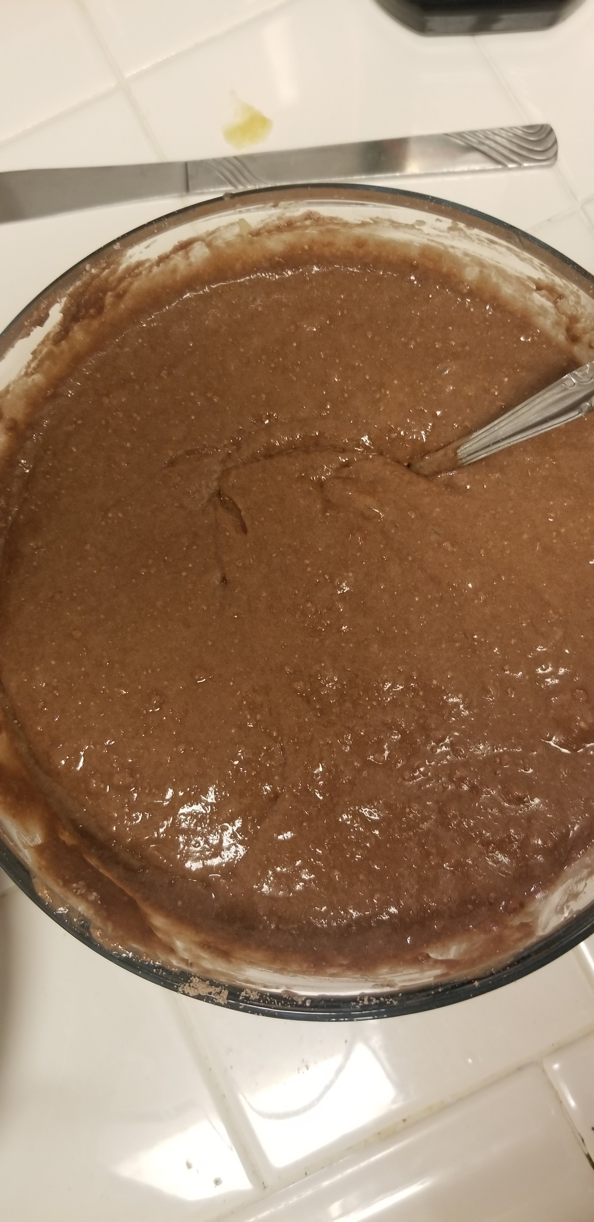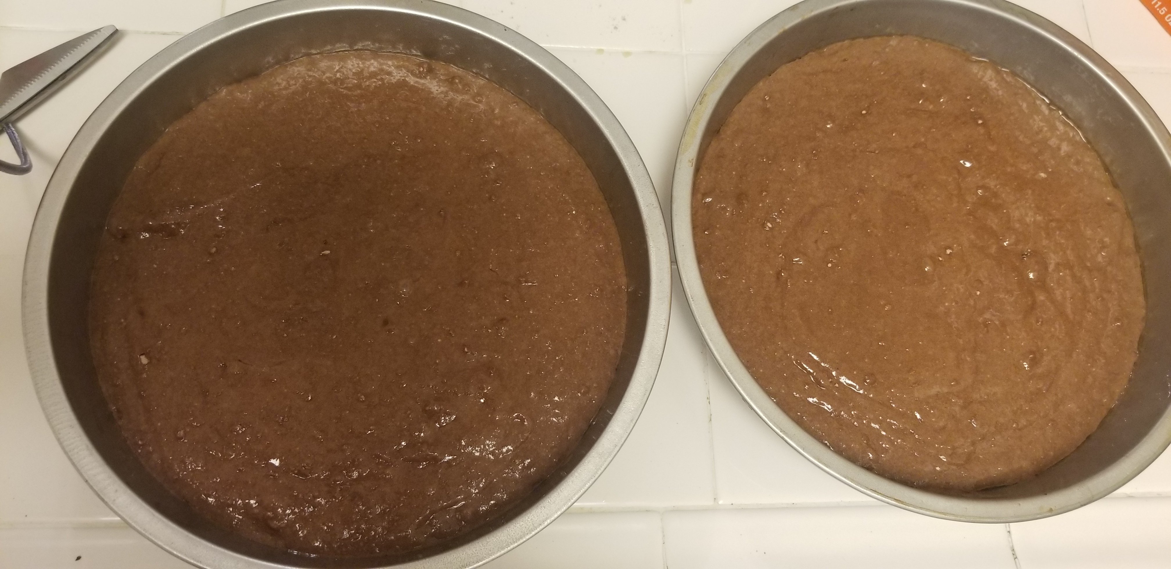 - After getting one cake out of the pan spread some chocolate peanut butter goodness all over the top of it.