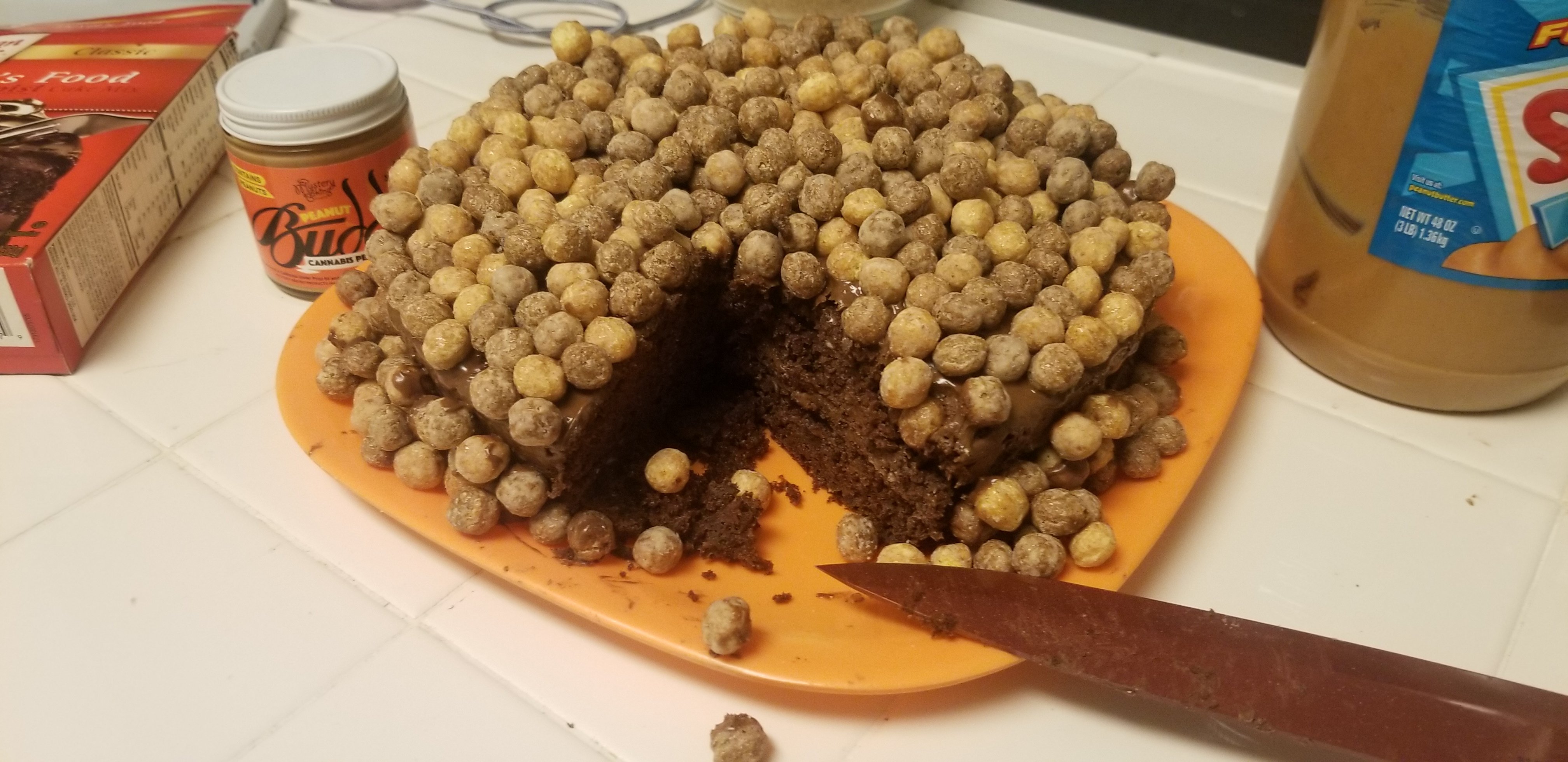 - After chocolate is spread on top and sides of cake, put the Reese’s Puffs Cereal all over the cake. Cover it up. You dont want to see very much cake at all. This will make a mess and you have permission to eat all the pieces that fall onto the counter (you should have started with a clean space you know.)
